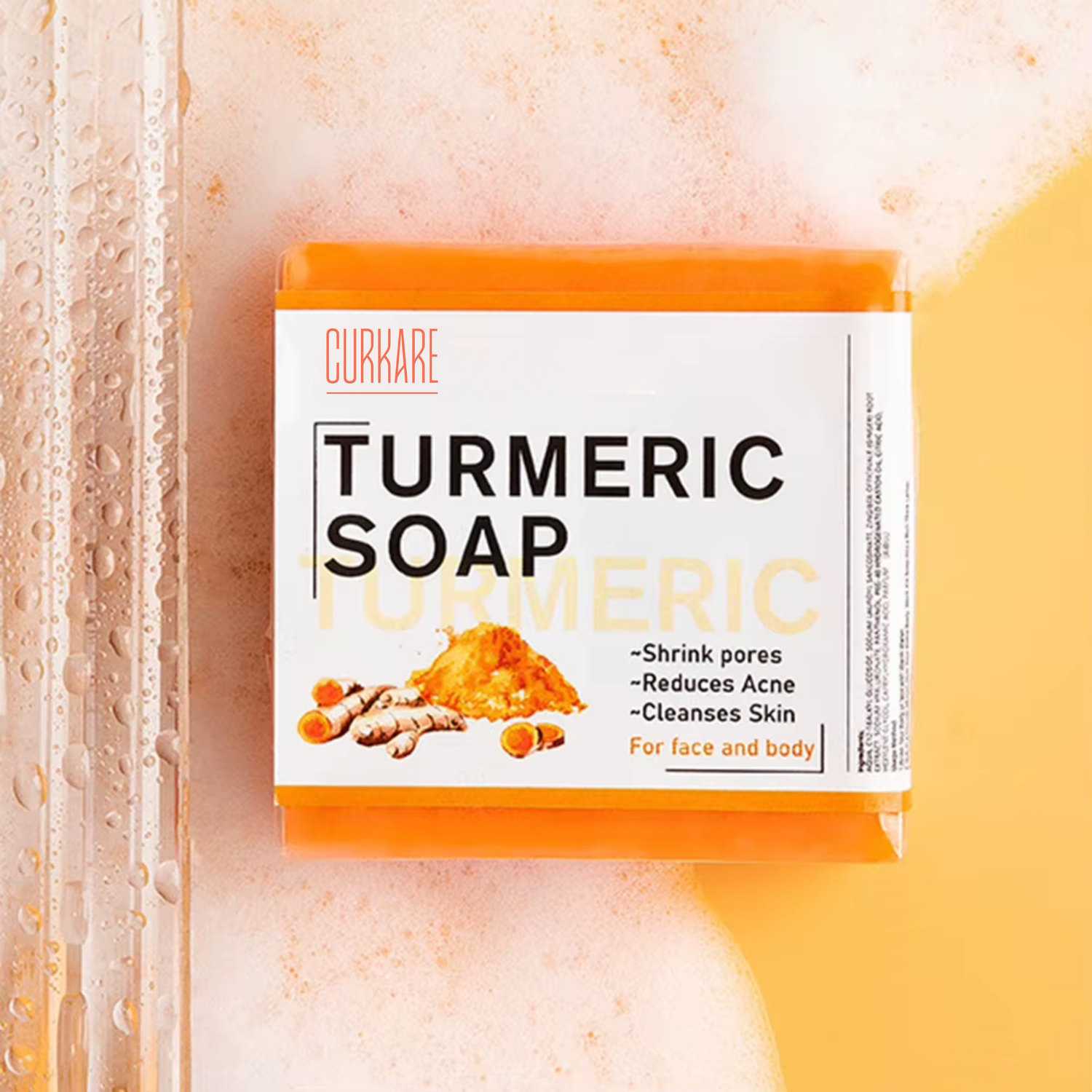 Faites mousser le savon au curcuma entre vos mains et appliquez sur peau humide. Nettoyez en douceur le visage ou les zones concernées, puis rincez à l’eau tiède.